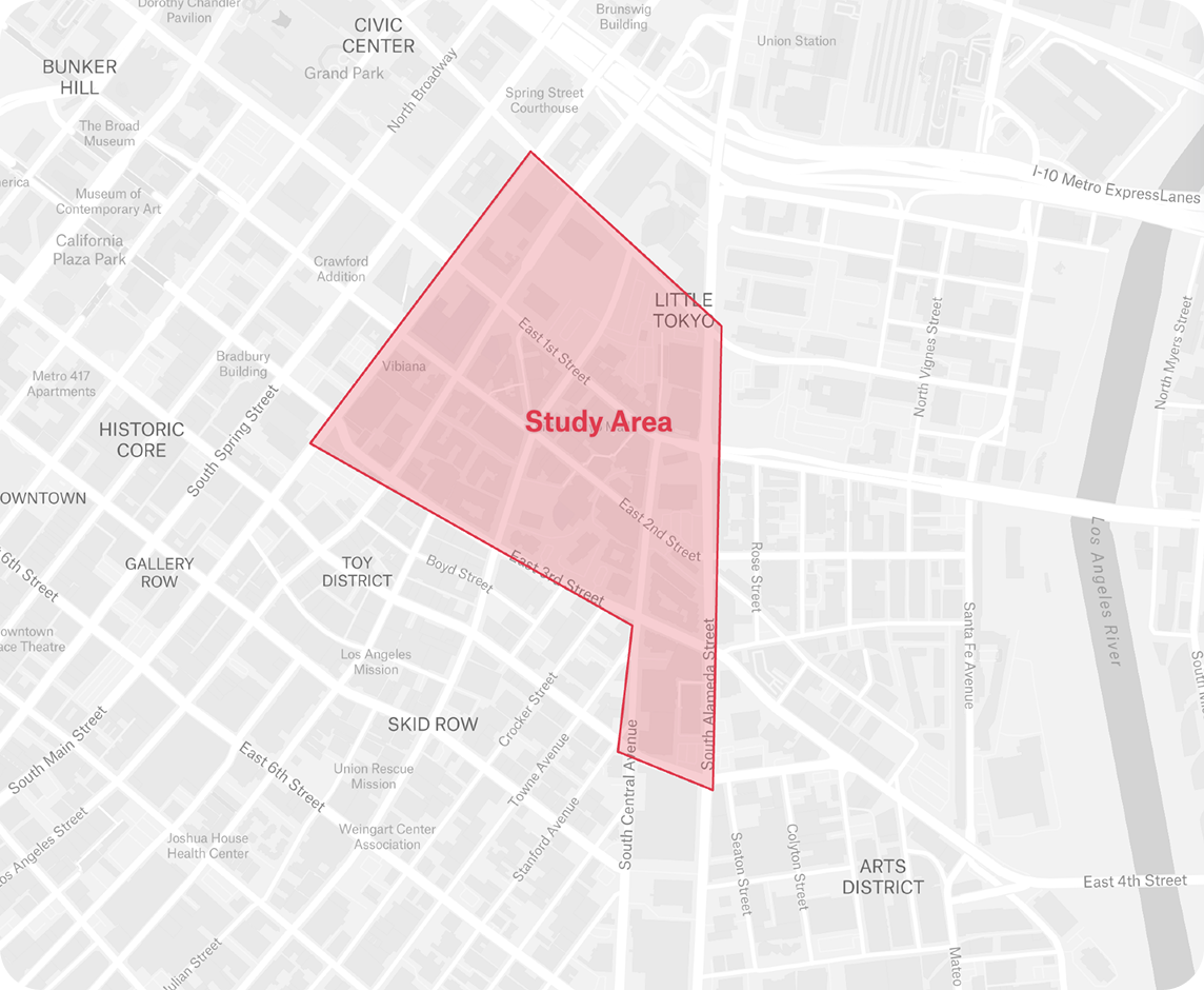 Note: Data reflects census tracts partially overlapping the eastern edge of Skid Row. Figures should be interpreted as directional indicators for the Little Tokyo core.